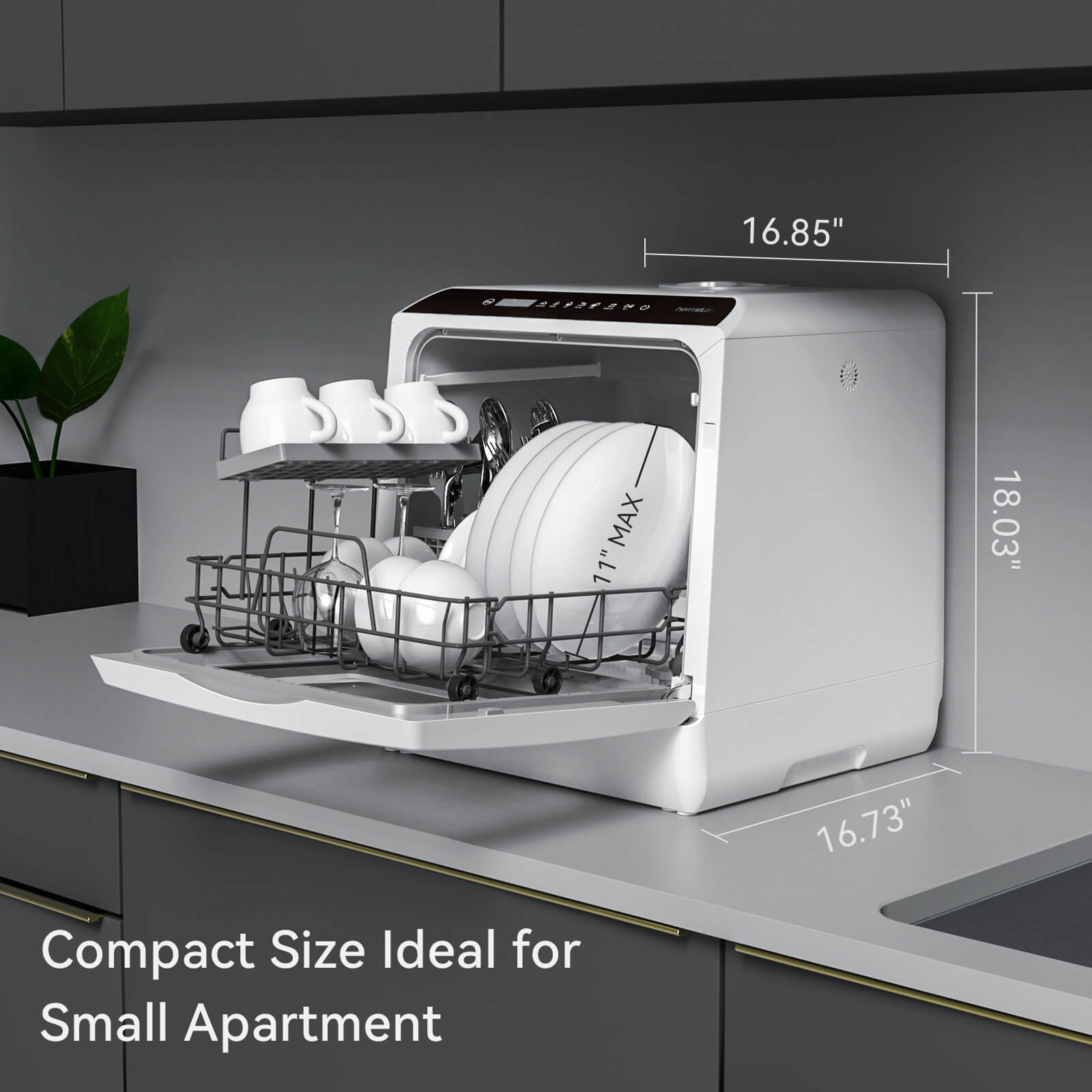 Four Place-setting Capacity - The Countertop Dishwasher has a size of 16.85×16.73×18.03 inches and a capacity of 4 place-setting, which can fit up to 12" dishes loaded at an angle.