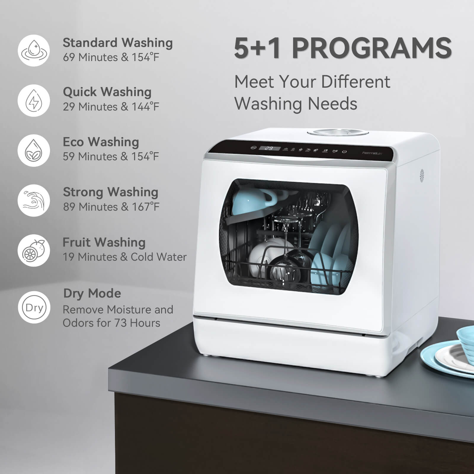 360 Washing - The mini dishwasher perfectly provides 5 washing programs: Standard Cleaning, Fast Cleaning, ECO Cleaning, Strong Cleaning and Fruit Cleaning. Dual high water pressure spraying arms give dishes that streak-free deep cleaning.